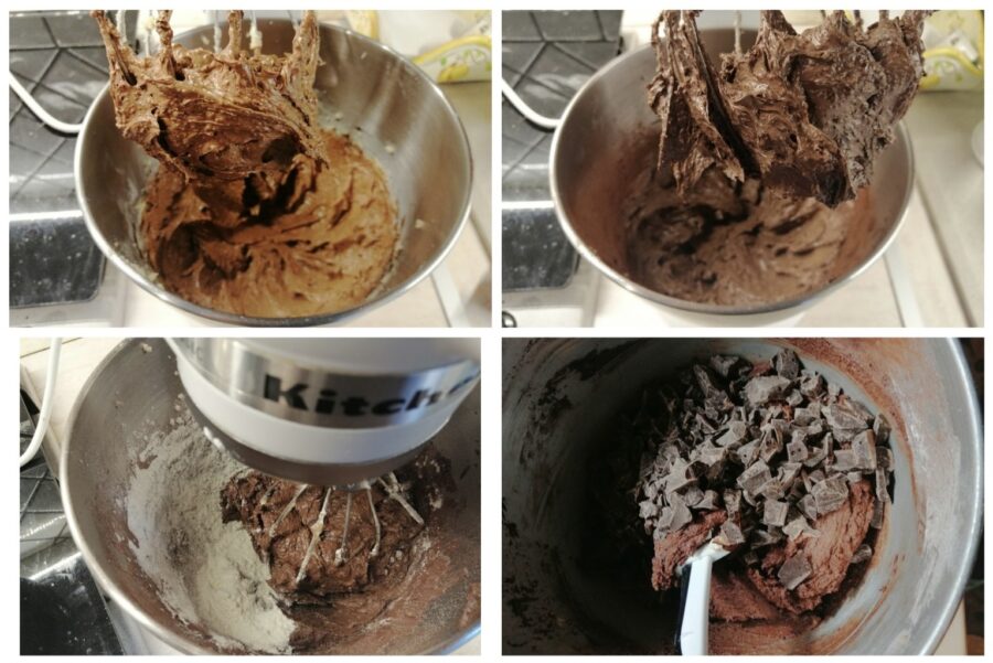 • Añade poco a poco la harina, el cacao y después la vainillina (o esencia de vainilla), la sal y la levadura; mezcla bien y luego incorpora el chocolate en trozos, trabajándolo con una espátula o una cuchara.