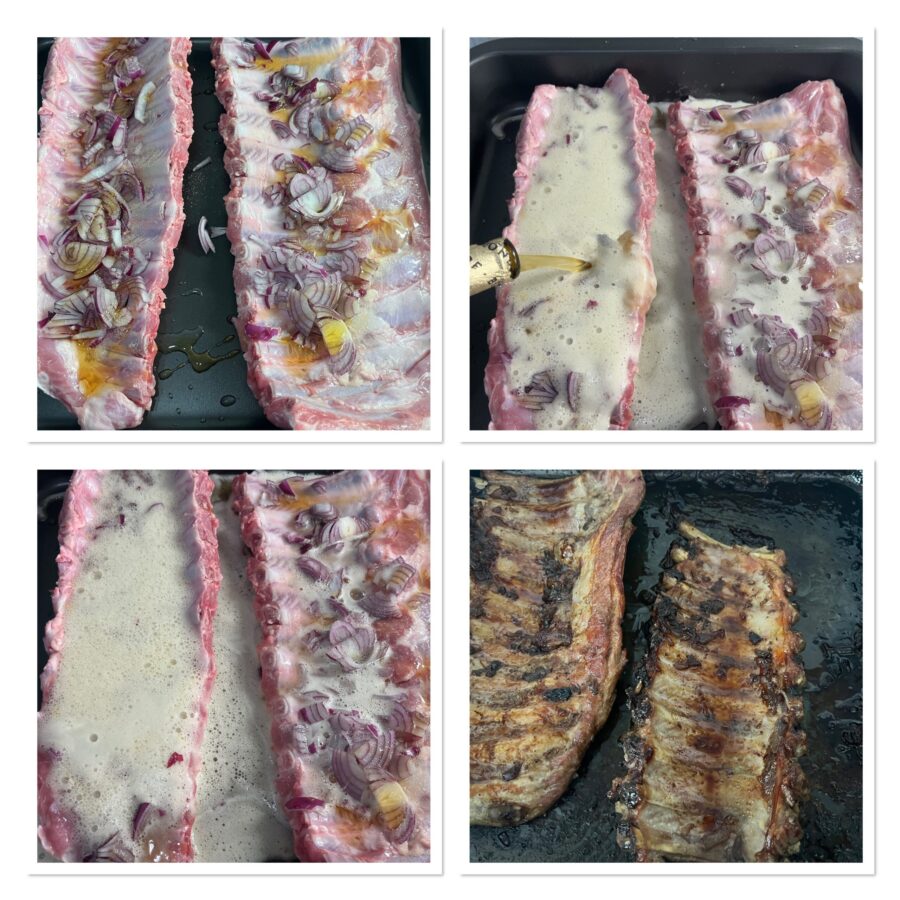 • Colocad las costillas de cerdo en una bandeja, añadid la cebolla picada, las hierbas aromáticas frescas o secas (pimienta negra, laurel, salvia, menta, orégano, ajo, romero, etc.), la miel y un espolvoreado de sal. Verted la cerveza sobre la carne, colocad en el horno ya caliente a 200°C, en modo estático. Coced durante aproximadamente 1 hora y 30 minutos, dándole la vuelta de vez en cuando y riendo con el jugo de cocción. Si durante la cocción la cerveza se evapora casi por completo, añadid agua y continuad.