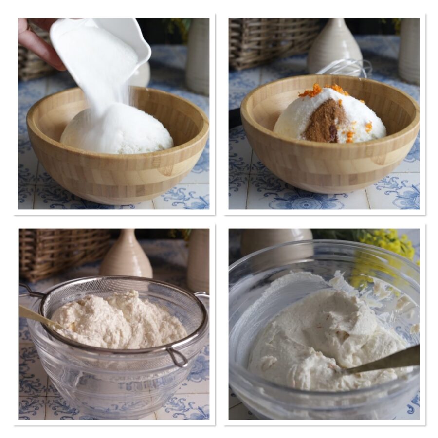 Con la ricotta bien seca, añade el azúcar, la canela, la esencia de vainilla y la ralladura de naranja muy fina y mezcla. Pasa la ricotta por un colador dos o tres veces; las pieles de naranja se quedarán atrapadas entre las mallas del colador, pero ya habrán liberado sus aceites esenciales, así que no te preocupes.