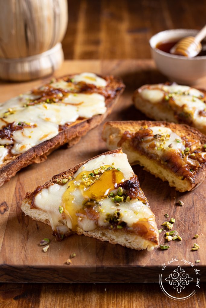 Distribuye las cebollas sobre el pan junto con cubitos de primo sale, que puedes sustituir también por pecorino u otros quesos a tu gusto; espolvorea si te apetece con un poco de frutos secos picados y vuelve a meter 5-10 minutos en el horno a 200°C, justo el tiempo de que el queso se funda. Añade un chorro de miel por encima, corta en porciones y sirve enseguida, todavía calientes, crujientes y fragantes.