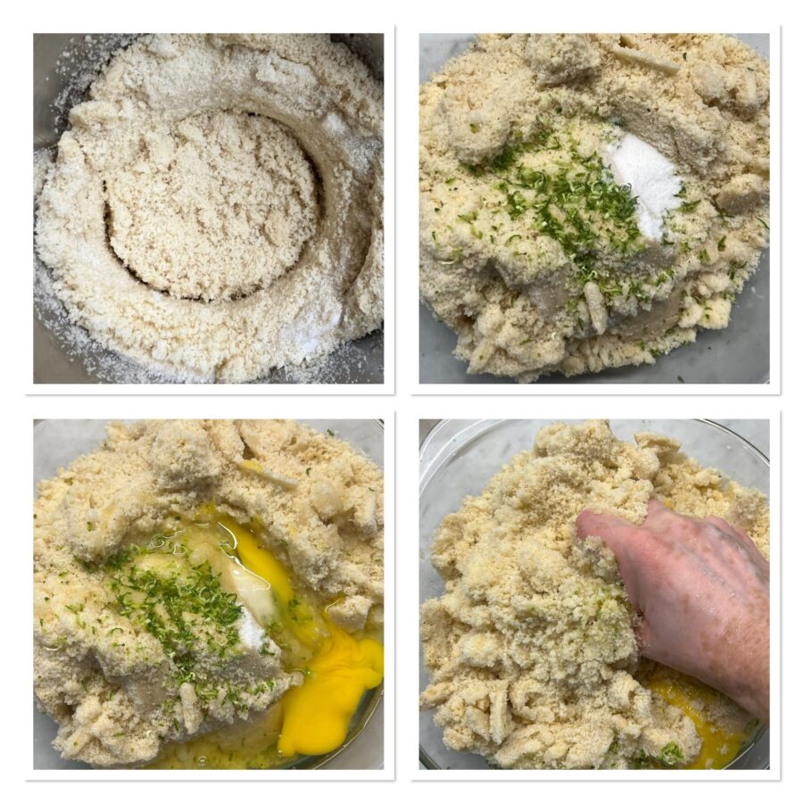 Vierte la mezcla de almendra sobre la mesa, añade la ralladura de limón, la vainillina o la esencia de vainilla, forma un volcán y añade las claras y los huevos. Amasa hasta obtener una mezcla suave pero consistente; si queda demasiado dura, añade una cucharada de clara, pero sin pasarse.