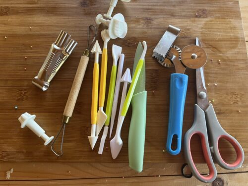 Estas son las herramientas que utilicé para las decoraciones: podéis ver moldes con expulsor, utensilios para pasta de azúcar, pinzas decorativas, rueda cortapastas, cuchillo y tijeras.