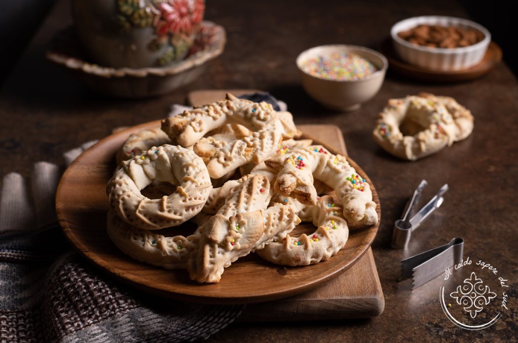 Cuddureddi di Caltagirane alle mandorle o en italiano «collorelle di Calatagirone». Cuando mi amiga me habló por primera vez de estos dulces, debo decir que no los conocía. Aun así resulta extraño que, siendo siciliana y de Catania, no conociera estas delicias que se preparan precisamente en mi provincia. «Cuddureddi» en siciliano significa coronitas, así que oírlos llamar «collorelle» me impresionó un poco. «Collorelle», para ser sincera, no significa nada, porque si hubiéramos tenido que traducir literalmente deberíamos decir «coroncitas de Caltagirone» y en Sicilia -créeme- hay muchísimos dulces que se llaman «coroncine» o «cuddureddi» y todos son diferentes entre sí. Pero dejando a un lado las disertaciones sobre el nombre de este dulce, vayamos al grano y a las características específicas de una elaboración no solo buena, sino también preciosa. Rellenos de pasta de almendra o incluso de mosto cocido o de miel, «i cuddureddi di Caltagirone» son dulces con un corazón suave y delicioso envuelto en una fina capa de masa hecha con harina, agua, azúcar y manteca de cerdo. Hacer «i cuddureddi» no es difícil en absoluto, pero en su preparación hay un paso fundamental: la decoración realizada con las pinzas decorativas apropiadas, paciencia y fantasía.