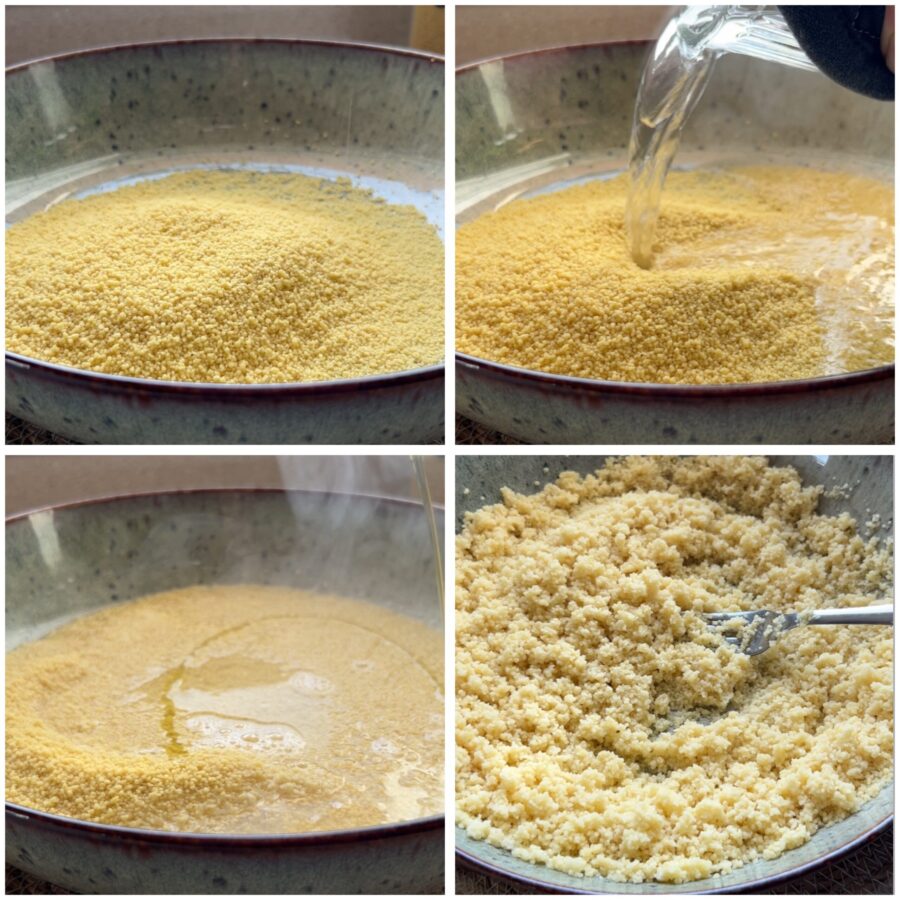 Mientras tanto, verted el cuscús en un bol y cubridlo con agua hirviendo ligeramente salada. Dejadlo reposar durante unos 5 minutos y luego desgranadlo bien con un tenedor.