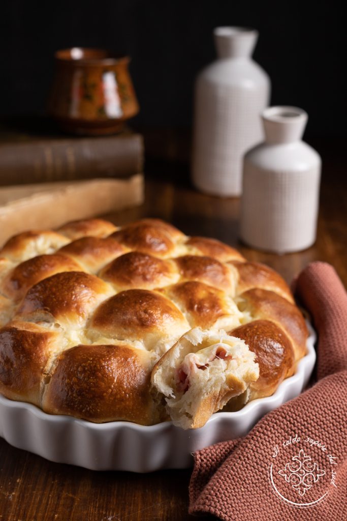 El Danubio es una típica tarta rústica napolitana compuesta por bolitas de masa fermentada rellenas de un relleno dulce o salado. El danubio, compuesto por muchas brioches en forma de bolita, no nace en Nápoles, pero se integró por completo en la tradición partenopea con el nombre de danubio, gracias a Giovanni Scaturchio, pastelero de origen calabrés, que en 1905 fundó una pastelería en Nápoles en la plaza San Domenico Maggiore, pastelería aún renombrada hoy en día. En los años 20 del 1800 Scaturchio, vuelto a Nápoles después de la Gran Guerra, trajo consigo una esposa de Salzburgo. De su pastelería ya eran conocidos y renombrados muchos dulces de la tradición, pero precisamente desde los años 20 comenzaron a producirse también dulces austriacos, nuevos para los paladares napolitanos, entre ellos el Strudel, la tarta Sacher y precisamente los Buchteln, formados por bolitas de brioche rellenas de crema y mermelada. El nombre, en cualquier caso, demasiado “exótico” para este dulce, pronto se italianizó en Briochina dulce del Danubio y por su versatilidad pronto se creó una versión salada rellena de provola, salami y hoy también jamón. Hoy prepararemos una versión que no es exactamente la receta de la abuela del Danubio salado, porque la masa brioche está hecha con una masa sin huevos, que resulta igualmente súper suave. Se trata de un danubio salado muy tierno, fácil sin mantequilla y sin huevos, con una masa ligera y muy sabrosa que al final parece deshacerse en la boca. Si también te apetece preparar un danubio salado muy tierno que además sea un aperitivo vistoso y llamativo, acompáñame en la cocina y verás qué delicia!|