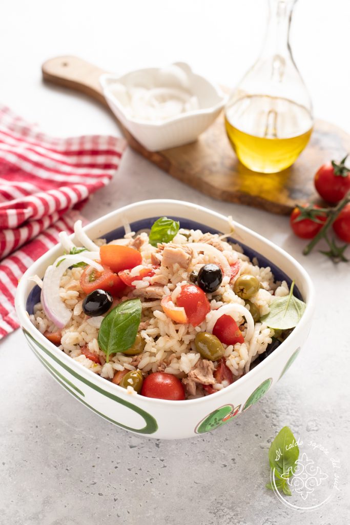 Ensalada de arroz a la siciliana, o más exactamente ensalada de arroz a la eoliana. Todos conocemos la ensalada de patatas a la eoliana, rica, sabrosa y aromática, perfecta para disfrutar en una cálida noche de verano, así que ¿por qué no hacer una versión con arroz? Las ensaladas de arroz son un must del verano y nos acompañan hasta bien entrado septiembre; por eso, con el verano a la vuelta de la esquina, hay que empezar a guardar todas esas recetas de platos fríos que nos permitirán disfrutar de los días soleados sin la preocupación de tener que pensar en la comida durante las horas más calurosas o mientras nos divertimos en la playa. El otro día preparé para los míos la ensalada de patatas a la eoliana y, al mismo tiempo que la aliñaba con atún, tomatitos, cebolla, aceitunas y alcaparras, pensé que estos ingredientes serían perfectos para una ensalada de arroz a la siciliana deliciosa, inspirada precisamente en la ensalada de patatas eoliana. Así que al día siguiente puse en práctica mi intuición y preparé una ensalada de arroz especial y realmente buena que desapareció en un instante. Vamos a la cocina: os cuento cómo hacer una ensalada de arroz perfecta y original, pero antes os recuerdo que si queréis manteneros al día con todas mis recetas podéis seguir mi página de Facebook (aquí) y mi perfil de Instagram (aquí).