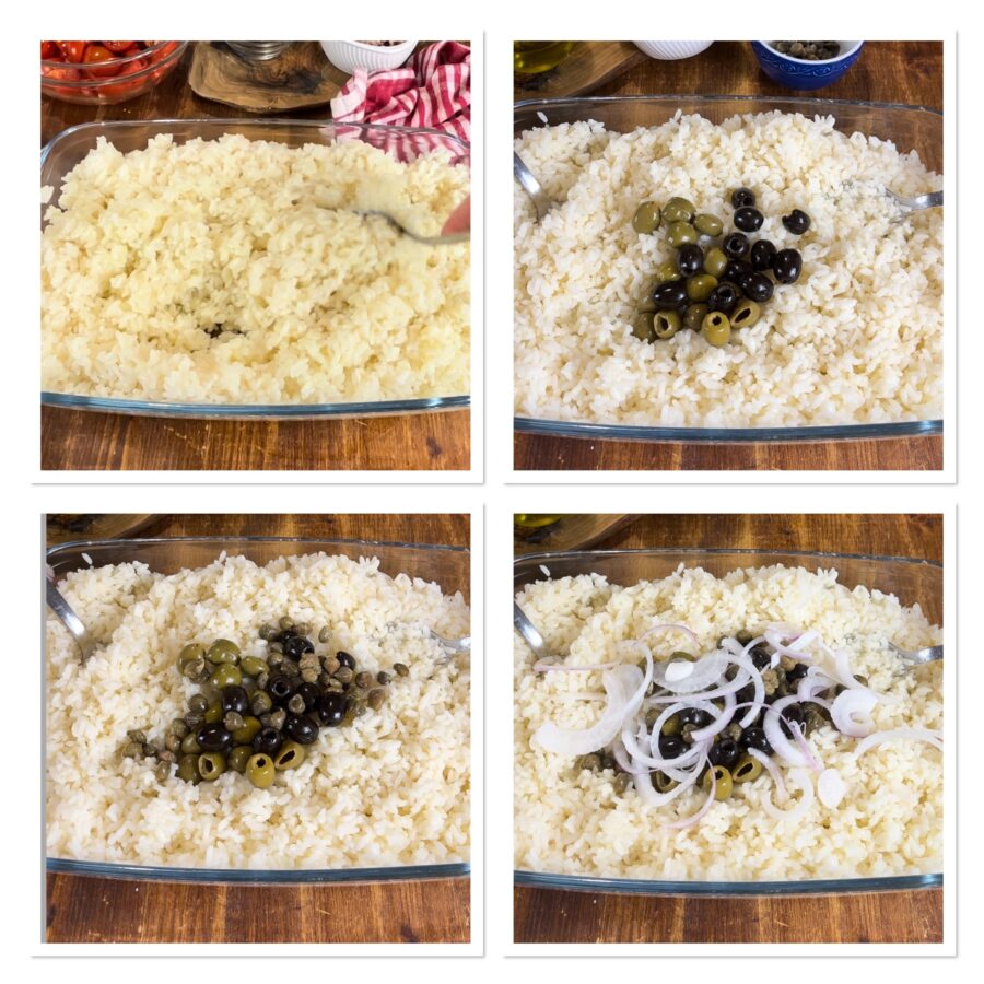 Aliña el arroz con un buen chorro de aceite, añade las aceitunas, las alcaparras y la cebolla cortada en láminas finas,