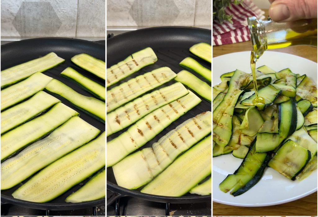 Calienta una plancha de hierro fundido antiadherente y asa rápidamente las láminas de calabacín; bastarán uno o como mucho dos minutos, el tiempo justo para que cojan color. Luego sálalas ligeramente y colócalas en un plato con un buen chorro de aceite. A medida que vayas haciéndolas, mantenlas calientes y se ablandarán aún más.