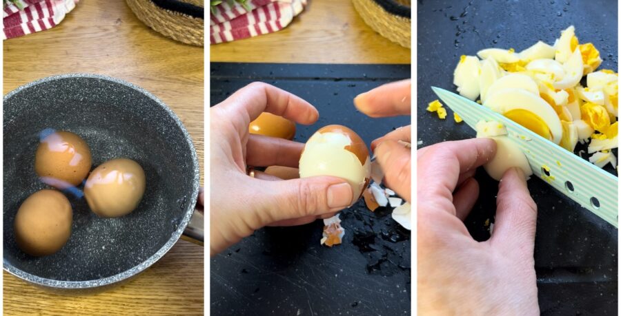 Introduce los huevos en una olla llena de agua, lleva a ebullición y cuece durante 10 minutos desde que empiece a hervir; luego escurre y deja enfriar antes de pelarlos y picar dos de ellos.