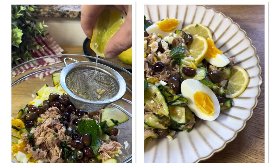 Reúne en el mismo bol los calabacines, los huevos duros picados, el atún escurrido, la menta y las aceitunas,
