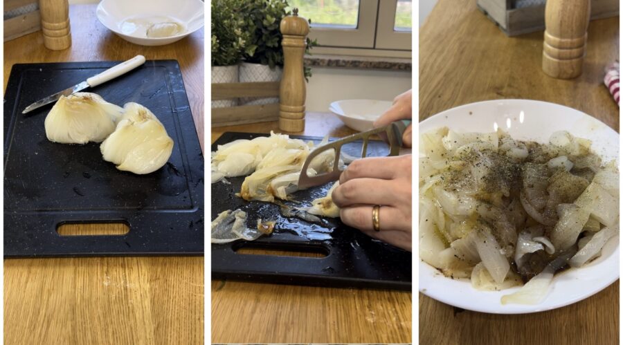 Una vez cocidas las cebollas, peladlas y extraed solo el interior, cortadlo en rodajas y colocadlo en un plato. Aliñad con sal, aceite, vinagre, pimienta negra, ajo y perejil si os apetece, y mezclad.