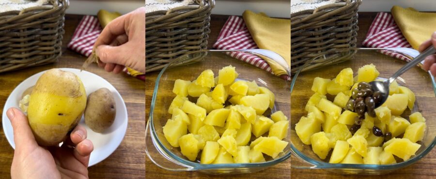 Pelad las patatas frías y cortadlas en dados, añadid las aceitunas,