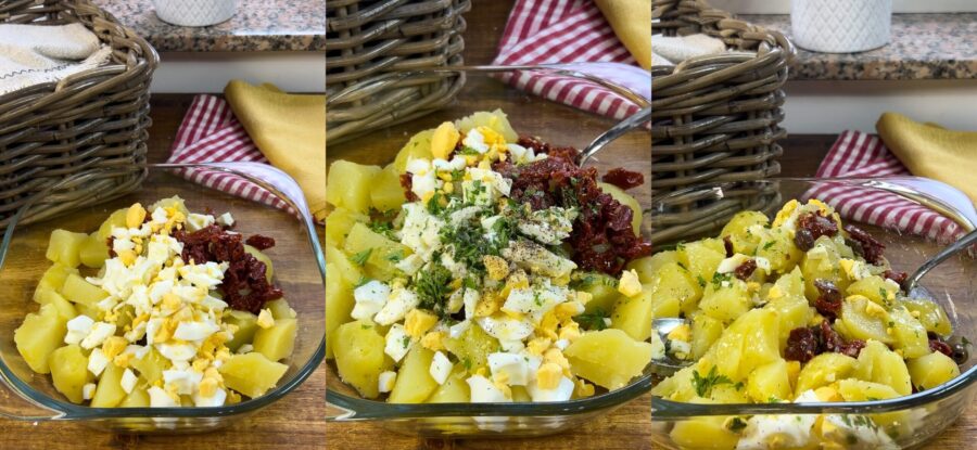 sal, aceite, pimienta, vinagre y perejil picado. Mezclad y la ensalada de patatas sabrosa estará lista para disfrutar.