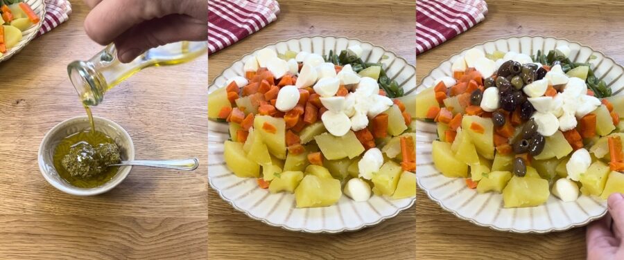 Hierve las zanahorias durante 10 minutos en agua hirviendo y deja que se enfríen antes de pelarlas y cortarlas en trocitos (yo ya las tenía listas en la nevera). Reúne todo en un plato, añade las bolitas de mozzarella partidas por la mitad,