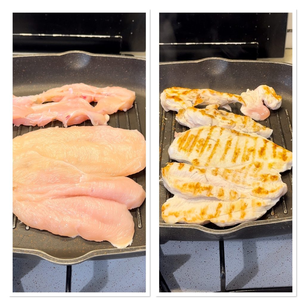 Calienta una parrilla de hierro fundido o una sartén normal de fondo grueso y cocina las filetes de pechuga de pollo por ambos lados, dándoles la vuelta de vez en cuando. Sala y, una vez cocidas, colócalas en una tabla y córtalas en trocitos.