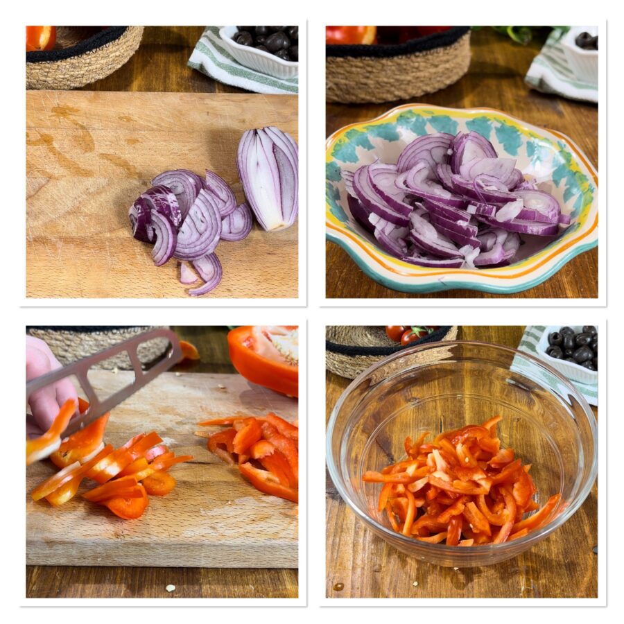 Enjuaga el pimiento, quítale el rabillo, las semillas y las tiras blancas, córtalo en cuatro a lo largo y luego en tiras finas tipo bastoncillo. Lava también los tomatitos o los tomates y córtalos en gajos.