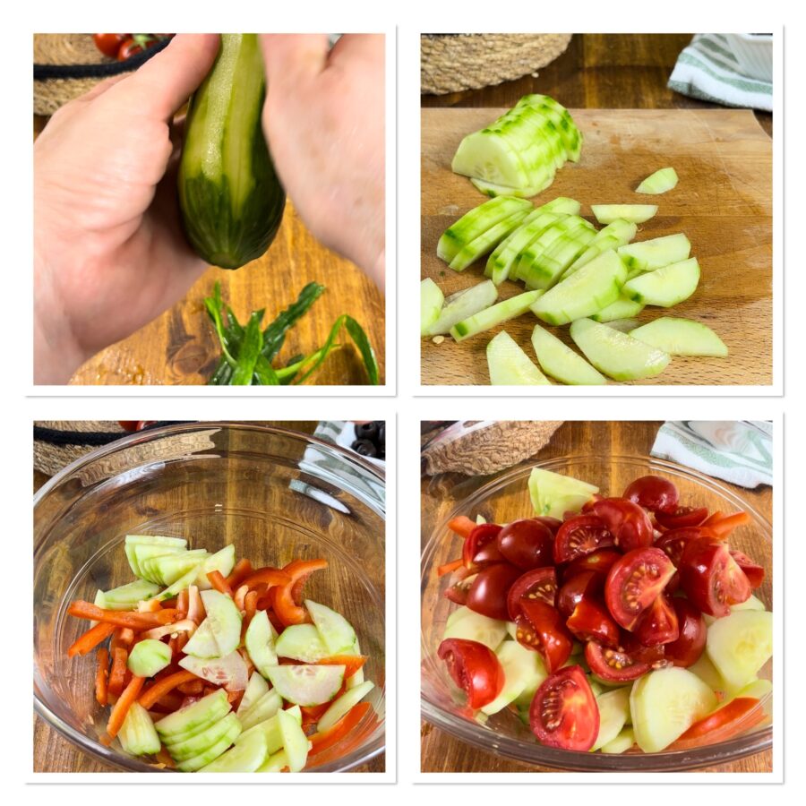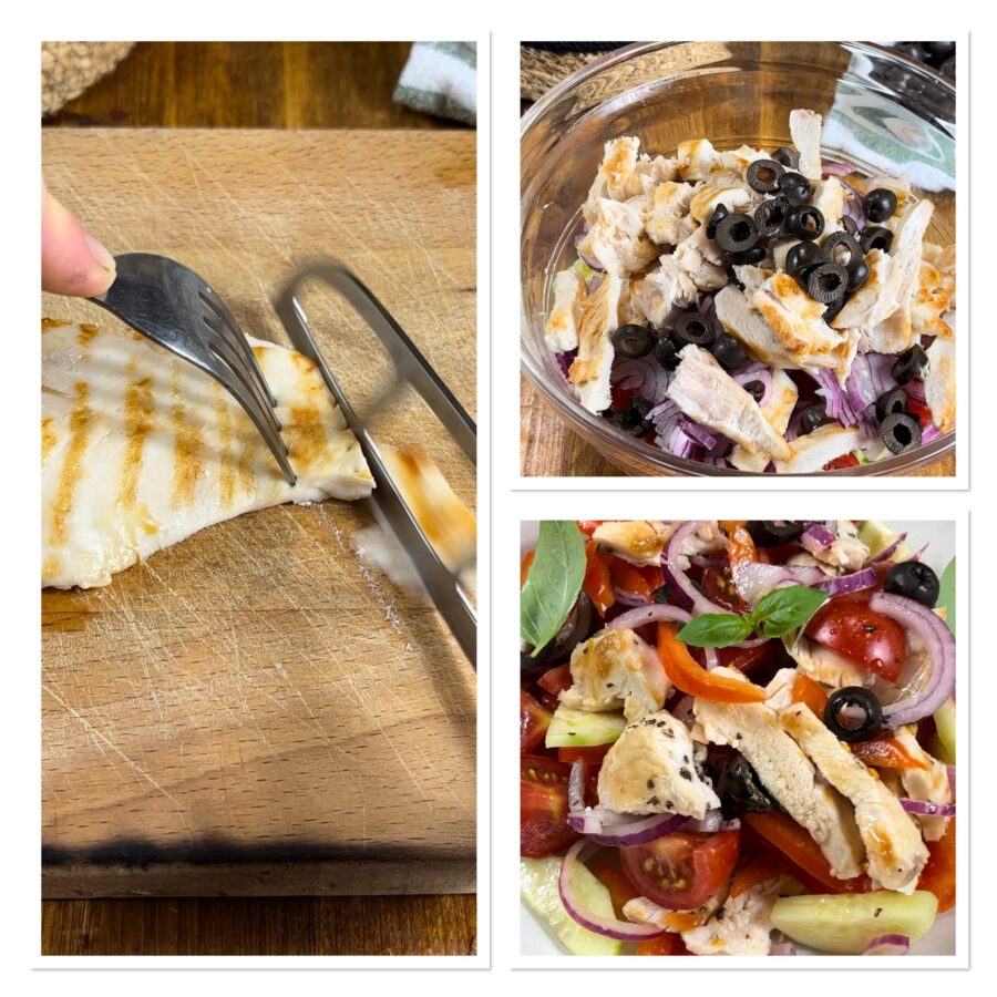 Pero vamos a la cocina, nuestra receta de pollo en ensalada griega nos espera; estoy segura de que esta ensalada de pollo fresca, ligera y nutritiva también os conquistará.
