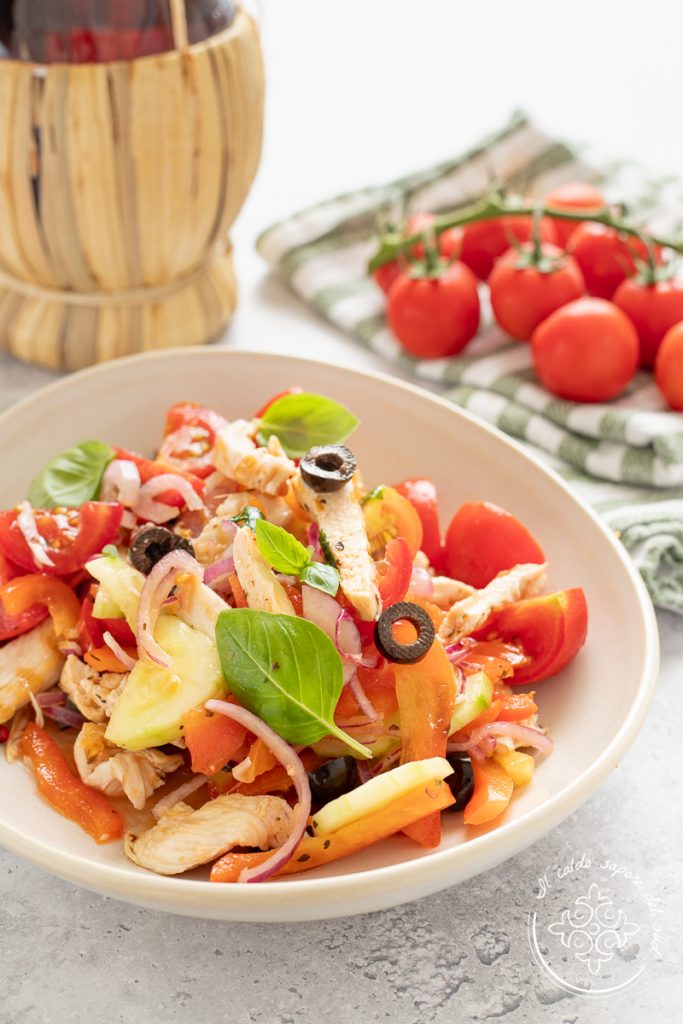Esta ensalada de pollo ligera con verduras es un sabroso plato único o un segundo típico de verano, fresca y ligera, que se puede preparar con antelación y consumir fría.