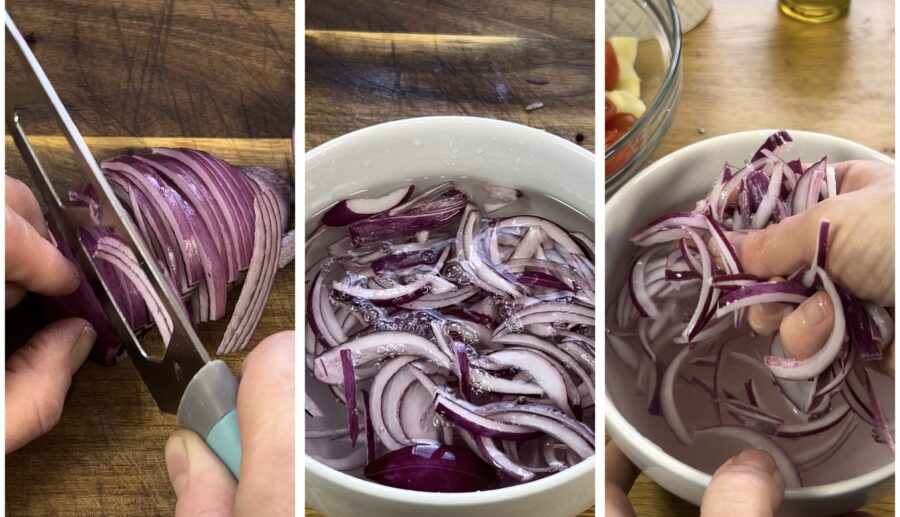 Pela la cebolla, enjuágala y córtala en láminas. Si no te gusta su sabor fuerte, colócala en un bol, añade medio cucharada rasa de sal y 50 ml de vinagre, mezcla y deja reposar 10 minutos; verás que suelta gran parte de su agua y el olor punzante disminuirá.