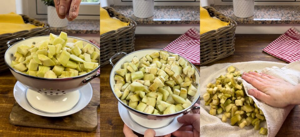 Pela las berenjenas y córtalas en dados, colócalas en un colador, espolvoréalas con un poco de sal y espera a que expulsen parte de su agua de vegetación.