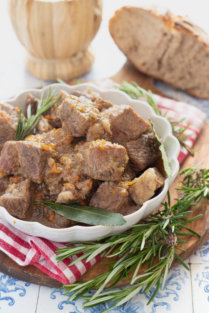 Luego verted el vino y dejad que evapore el alcohol. Añadid el romero y el laurel, salad y poned la tapa. Coced a fuego mínimo en el fuego pequeño durante 2 horas y media – 3 horas, todo depende del tamaño de los trozos de carne. Añadid un poco de agua solo si hace falta. Cuando la carne esté tierna, apagad el fuego y dejad reposar unos diez minutos: nuestro estofado estará listo para disfrutar.