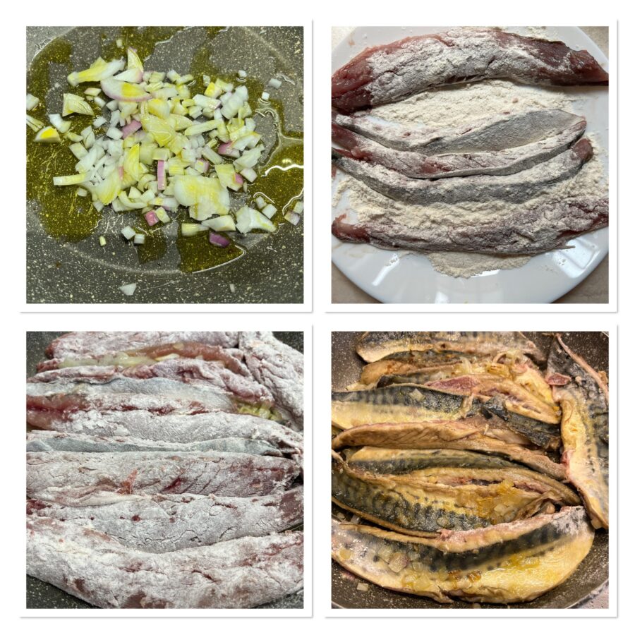 Pela, enjuaga y lamina la cebolla, ponla en una sartén amplia de fondo grueso y déjala pochar con un generoso chorro de aceite. Pasa los filetes de caballa por la harina, colócalos en la sartén y dóralos primero por un lado y luego por el otro, dándoles la vuelta con delicadeza.