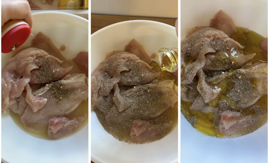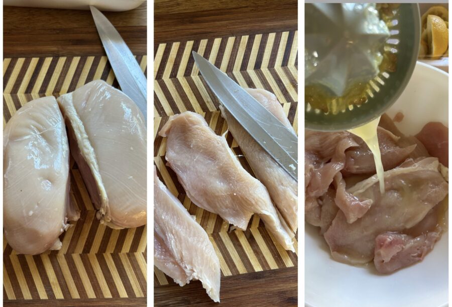 • Corta la pechuga de pollo con un cuchillo afilado o cómprala ya fileteada; yo prefiero tener lonchas no demasiado finas para que la carne no se seque y quede jugosa. Reúne las lonchas de pechuga en un bol, añade el zumo de limón,