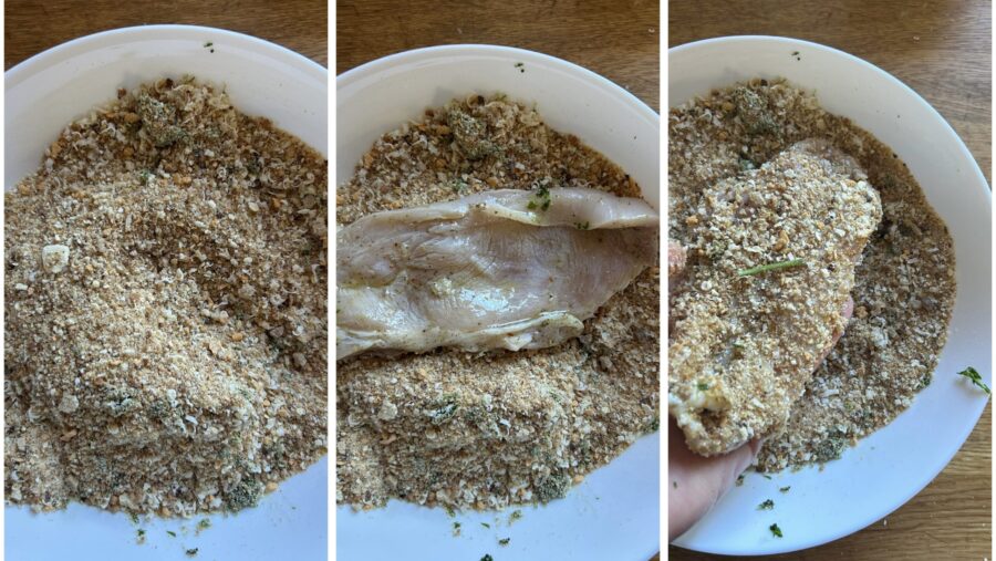 Te recomiendo usar la mezcla de especias para asado ya preparada, porque aporta al pollo un sabor equilibrado que recuerda al pollo asado; como alternativa usa sal, pimienta, romero y orégano. Si preparas los filetes con antelación, el empanado tenderá a ablandarse al absorber la humedad de la carne, pero puedes recalentarlos antes de servir o prepararlos con antelación y guardarlos en la nevera, cubiertos con film, crudos, para cocinarlos mientras pones la mesa.