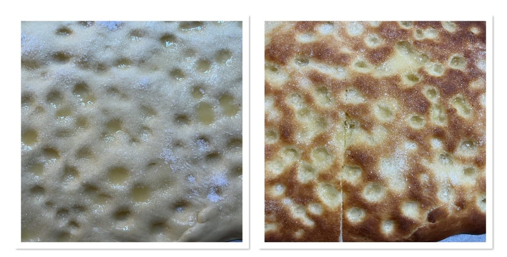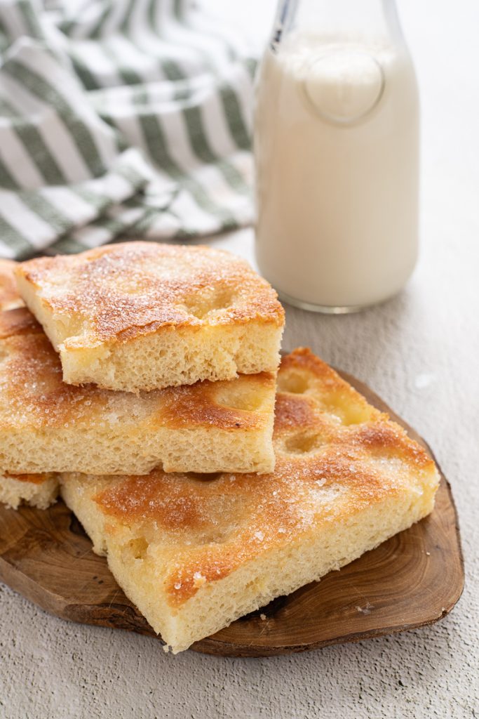 Nuestra focaccia dulce está lista para servir; la que sobre podéis envolverla bien en papel de horno y disfrutarla al día siguiente.