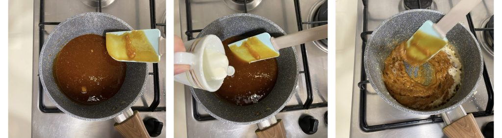 • Empezad derritiendo el azúcar cucharada a cucharada. Evitad remover el azúcar durante este proceso, ya que podríais formar grumos en el caramelo. Una vez completamente derretido, calentad la nata en el microondas (bastarán unos segundos, evitad que llegue a hervir) y añadidla al caramelo. Mezclad rápidamente la mezcla.