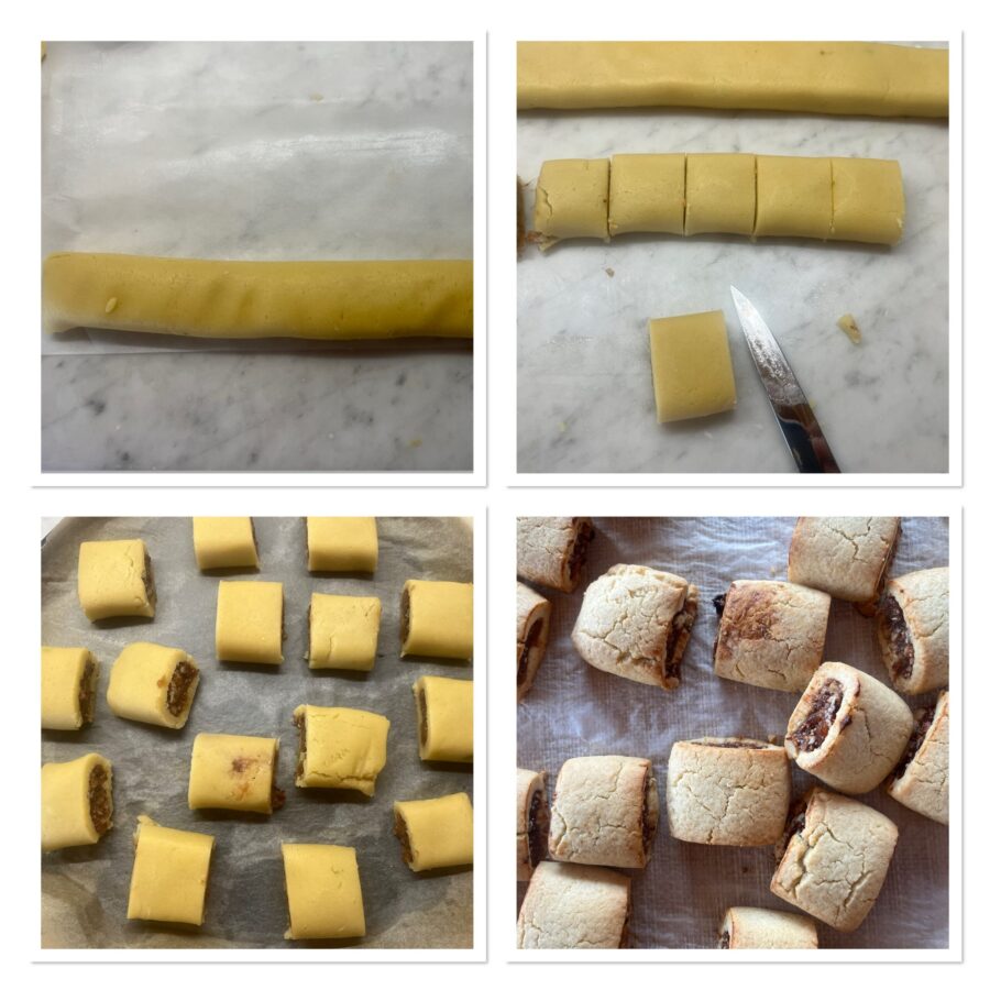 Coloca en el congelador 30 minutos, luego con un cuchillo afilado corta los cilindros en trozos de 3-4 cm y dispónenlos sobre el papel de horno. Hornea en modo ventilado durante 15-20 minutos a 180°C, con el horno ya caliente; después saca y deja enfriar.