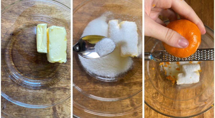 Para hacer las galletas suaves de mandarina, mezclad en un bol la mantequilla a temperatura ambiente, el azúcar, la piel rallada de las mandarinas,