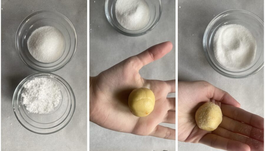 Una vez transcurrido el tiempo necesario, la masa estará más compacta y fácil de trabajar. Preparad dos cuencos pequeños con azúcar granulado en uno y azúcar glas en el otro (fundamental para dar el aspecto «agrietado» a las galletas durante la cocción).