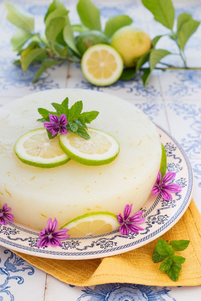 Recientemente volví a hacer el gelo de limón, realizándolo en un único molde y sirviéndolo como una tarta; para acentuar su aroma añadí unas ralladuras de limón al final de la cocción y justo antes de verter la mezcla en el molde de silicona. En esta versión omití el azúcar.