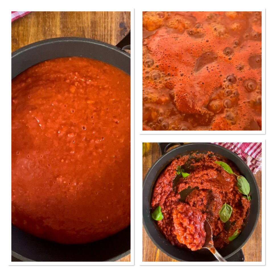 Ocupaos de la salsa de tomate: podéis hacerla en casa siguiendo la receta del enlace superior, o utilizar una passata casera. Si usáis la passata en bote, vertedla en una sartén, cocedla durante unos 15 minutos a fuego vivo y dejadla reducir; ajustad de sal y añadid 1/2 cucharadita de azúcar si está demasiado ácida. Apagad el fuego, añadid aceite y albahaca, removed y reservad.