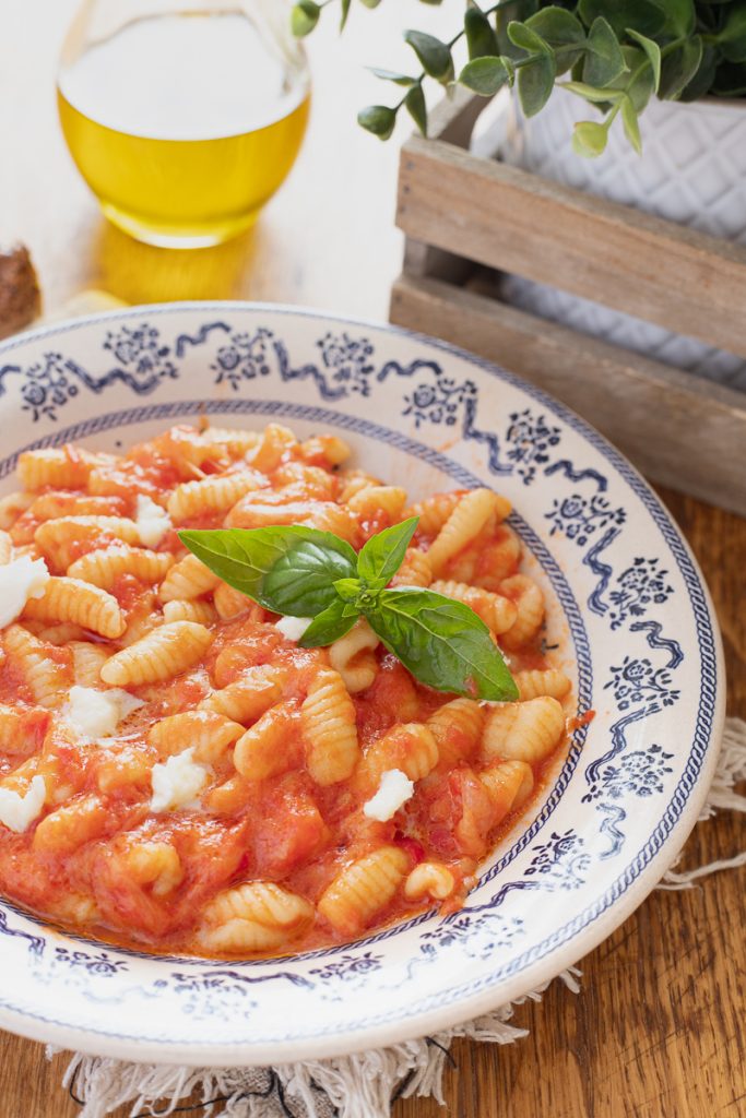 Los gnocchetti con tomate y mozzarella se sirven inmediatamente, todavía calientes y con la mozzarella fundida.