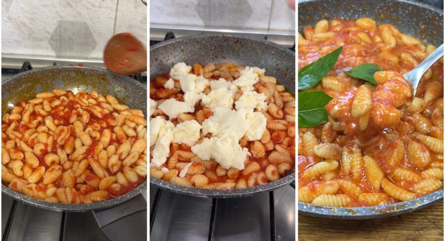 Sabéis que me encanta hacer pasta fresca y a lo largo de estos años hemos preparado varios tipos. Hicimos las Busiate caseras, los Cavatelli rigati caseros, los Maccheroni al ferretto y recientemente también los Gnocchetti sardi caseros. Sin duda, los gnocchetti sardi quedan estupendos con la salsa a la campidanesa, pero como me faltaban los ingredientes principales para hacerla, después de prepararlos decidí aliñarlos con una buena salsa de tomate casera, la misma que utilizo para la pasta alla Norma con la ricotta salata y también añadí mozzarella, para conseguir un plato que se inspira en los famosos Gnocchi di patate alla sorrentina, pero sin horno.