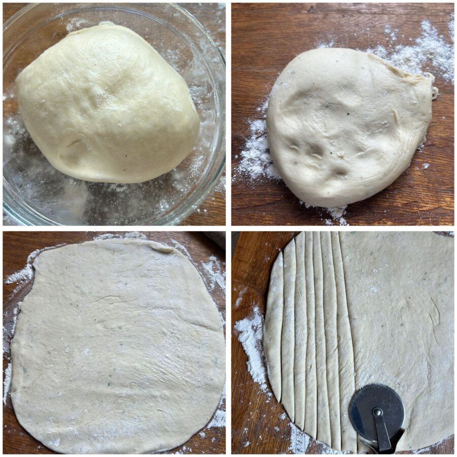 Una vez que haya doblado su volumen, no antes, estira la masa con el rodillo y córtala en tiras de más de 6-7 mm de grosor y al menos 1 cm de ancho. Unta las tiras con aceite de oliva y colócalas en una bandeja cubierta con papel de horno.