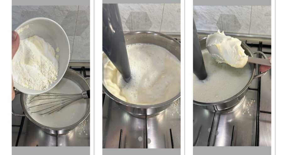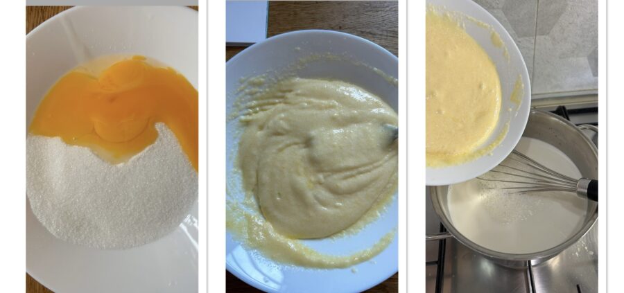 • Removiendo con la varilla, verted las yemas sobre los líquidos, y luego añadid las demás polvos previamente mezclados. Volved a llevar todo al fuego a 85° durante un par de minutos. (Ahora las yemas están pasteurizadas).
