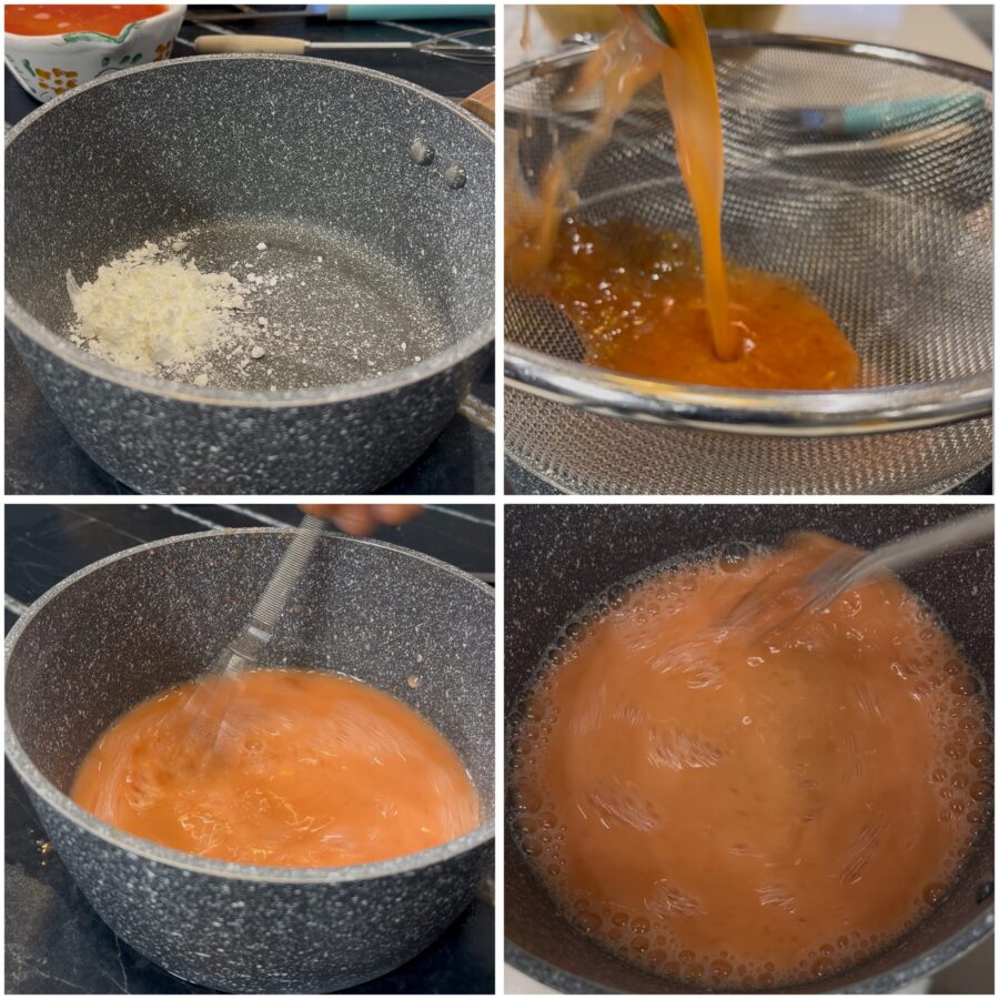 • En un cazo vierte el zumo de naranja colado y disuelve la maicena mezclando en frío. Añade la sal (y la miel, si te apetece o si el zumo está demasiado ácido) y ponlo al fuego a temperatura baja, removiendo continuamente con un batidor hasta que la salsa espese ligeramente. Apaga y reserva.
