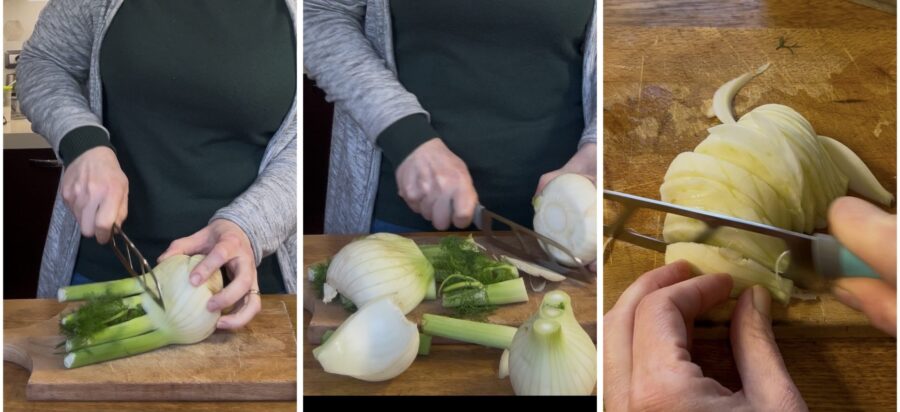 Para preparar los hinojos al horno a la mediterránea, comienza lavando los hinojos; quítales la barba y las hojas más externas y córtalos por la mitad. A continuación córtalos en láminas y colócalos en un cuenco.