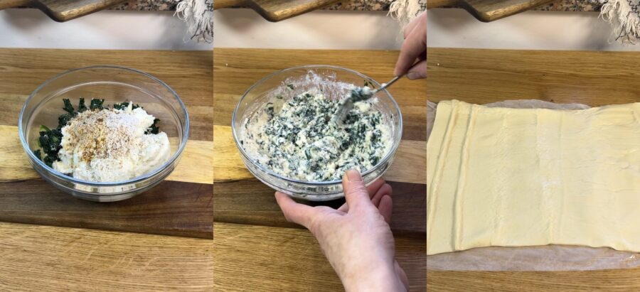 con la ayuda de una plantilla de cartón con forma de huevo, recorta la base y rellénala con la crema de ricotta y espinacas, manteniéndote al menos 1 cm alejado de los bordes. Recorta de la misma forma la masa de hojaldre y colócala encima del relleno.