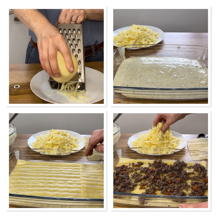 • Montamos las lasañas. Rallad el queso con un rallador de agujeros grandes, repartid en el fondo de la fuente una capa de bechamel y después una de láminas; dado que usamos las finas, no hace falta precocinarlas ni escaldarlas. Encima de las láminas distribuid un poco de ragú de forma uniforme, algo del queso recién rallado, pistachos y la salsa de pistacho.