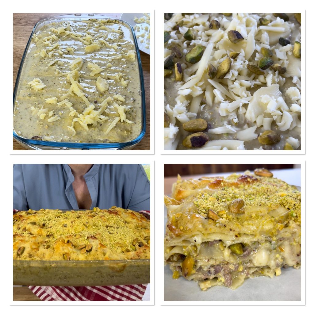 • Cubrid la última capa con bechamel de pistacho, queso rallado y pistachos enteros. Coced en horno estático a 200°C durante unos 35 minutos aproximadamente, o seguid las indicaciones del paquete. Sacad del horno, cubrid con un paño, dejad reposar 10-15 minutos y llevad a la mesa aún calientes, fundentes y cremosas.