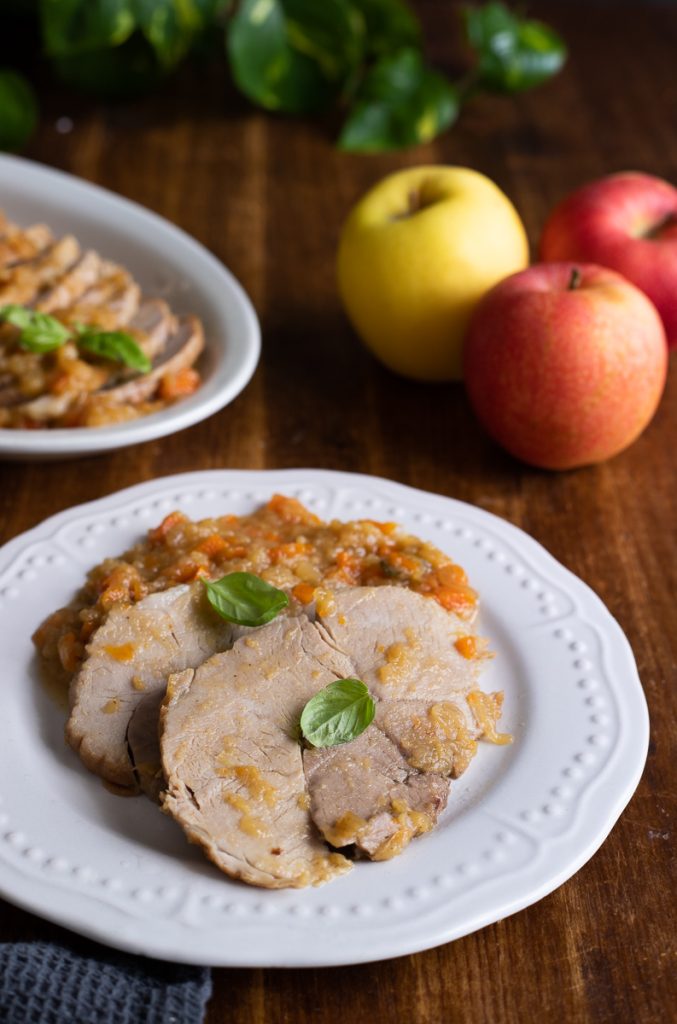 Lomo de cerdo asado con manzas, un asado de lomo de cerdo en cazuela, sencillo y sabroso. La carne de cerdo es sabrosa y muy versátil y, además, un corte económico y sencillo; se puede cocinar de forma que se convierta en un segundo original para Navidad o para las fiestas. Para valorizar un corte como el lomo y transformarlo en un asado sencillo, pero al mismo tiempo único y delicioso, hacen falta pocos cuidados y los ingredientes adecuados, y el resultado será tan bueno que os sorprenderá su potencialidad. Me encanta cocinar el lomo de cerdo y a menudo me gusta combinarlo con fruta, como cuando preparo el asado decerdo con manzanas o el asado de cerdo con naranja.