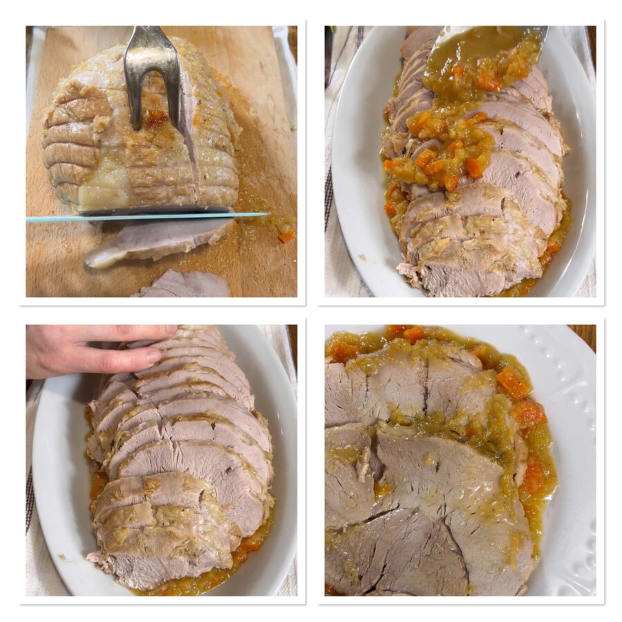 Al finalizar la cocción, deberían bastar 60-70 minutos; dejad reposar la carne unos diez minutos, luego cortadla en lonchas y servid inmediatamente junto con la salsa de cocción.