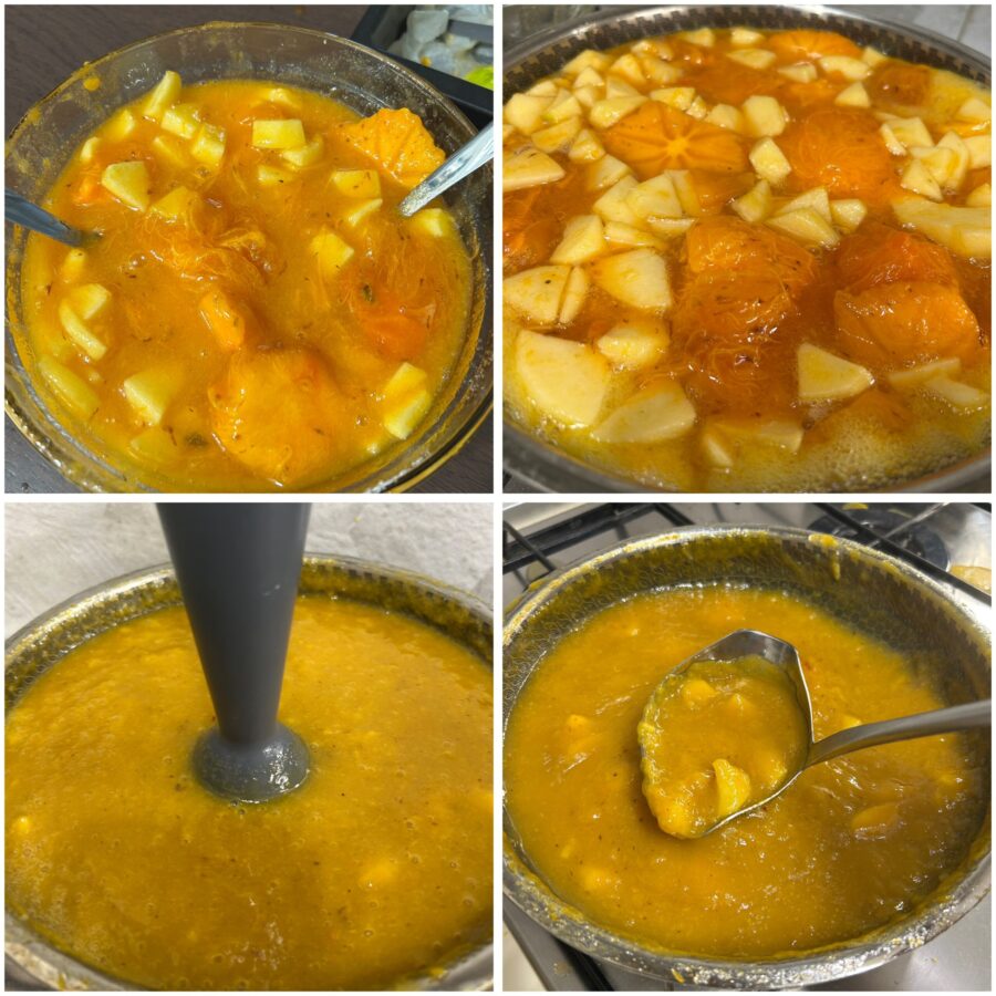 • A continuación, verted todo en una cacerola amplia y coced a fuego lento durante 35-45 minutos, removiendo continuamente. Los tiempos de cocción varían según el tipo de caqui y su grado de maduración, que los hace más o menos «líquidos». Una vez terminada la cocción, triturad la mermelada con una batidora de inmersión y devolvedla al fuego durante otros 5 minutos.