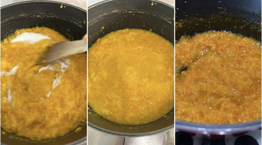 • Añade el azúcar y pon al fuego, cocinando 40 minutos desde que empiece a hervir a temperatura moderada, removiendo con frecuencia. Cuando la mermelada se haya reducido y espesado y no veas partes líquidas, puedes apagar el fuego y, una vez fría, guardar la confitura en la nevera y consumirla en unos 15 días.