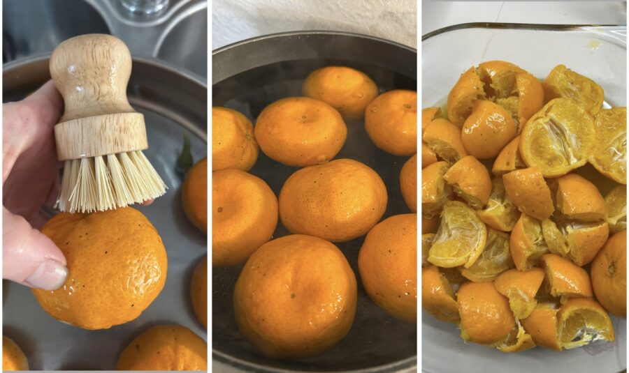 • Para hacer la mermelada de mandarinas, empieza limpiando los frutos: lávalos bajo el chorro de agua y frótalos con un cepillo; después de quitarles el pedúnculo, ponlos en una olla llena de agua y cuécelos 20 minutos desde que empiece a hervir, dándoles la vuelta con frecuencia porque tenderán a flotar y a cocerse de forma desigual. Escurre las mandarinas y córtalas en 4-5 trozos, eliminando la mayor cantidad de semillas posible.