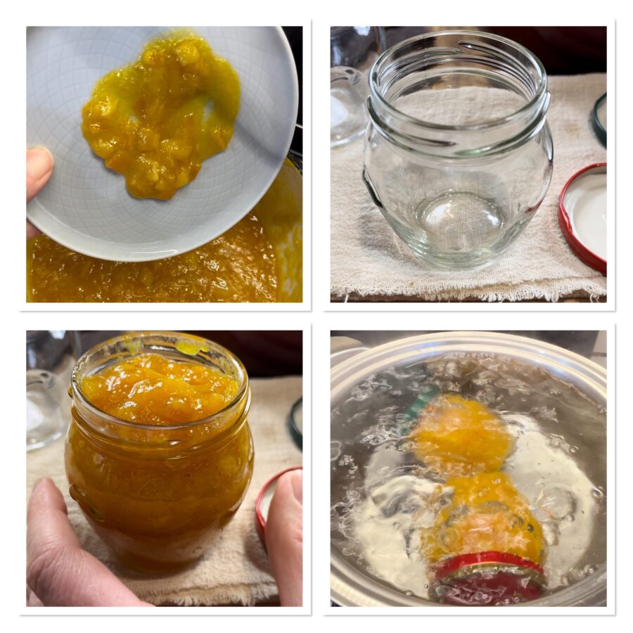 Rellenadlos inmediatamente con la mermelada hirviendo con cuidado de no quemaros; cerradlos muy bien y volved a hervirlos durante unos diez minutos, cubiertos completamente por agua.